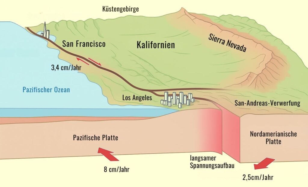 An einigen Stellen bewegt sich die Verwerfung konstant und langsam, an anderen verhakt sie sich und kann dann durch ruckartige Verschiebungen zu heftigen Beben führen.