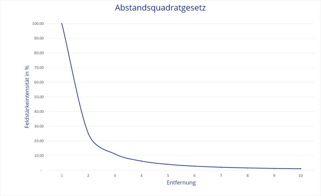 Die Stärke des Feldes nimmt mit zunehmendem Abstand zum Verursacher "Abstandsquadratgesetz" (*1) stark ab. Genauso nimmt die schädliche Wirkung des Elektrosmog ab, je weiter man von der Quelle entfernt ist.