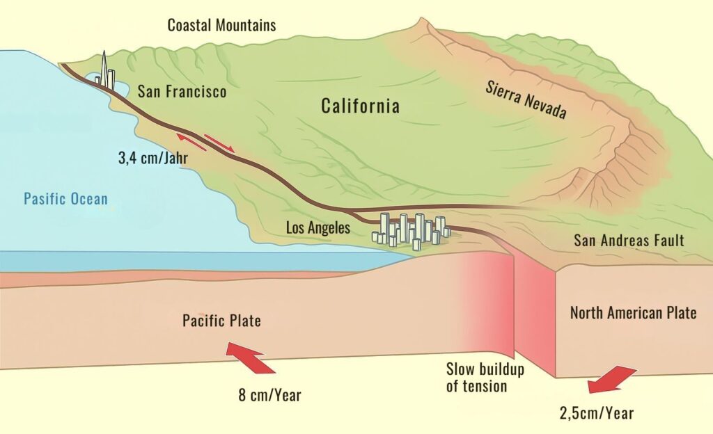 La faille la plus connue est la faille de San Andreas. Elle est constituée de deux plaques tectoniques qui glissent l’une sur l’autre. San Francisco se trouve sur la plaque américaine, Los Angeles sur la plaque pacifique. La distance décroissante est d’environ six centimètres par an.