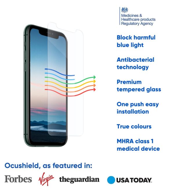 Unsere qualifizierten Optiker entwickelten Bildschirmschützer für Smartphones und Tablets, die bis zu 90% der schädlichen Blaulichtemissionen effektiv blockieren. Die Bildschirmschützer bestehen aus superstarkem Panzerglas mit einer kratzfesten, Anti-Fett-Beschichtung, sodass sie damit durch dick und dünn gehen können. Im Gegensatz zu Apps und Nachtmodus-Einstellungen bekommt Ocushield das hin, ohne den Bildschirm zu verfärben.