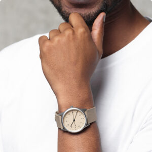 Die Mudita Moment NR ist in zwei Farben erhältlich: Weiß und Beige – eine harmonische Mischung aus Sonnen- und Sandtönen. Letztere Variante wird mit einem beigen veganen Lederarmband geliefert, das durch seine verlängerte Länge von 130/80 mm für alle Handgelenke geeignet ist.