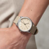Mit einem Durchmesser von 38 mm und einer Gehäusedicke von 10,8 mm eignet sich die Mudita Moment NR für die meisten Handgelenke. Das Uhrengehäuse wirkt elegant, dezent und passt problemlos unter Hemd- oder Blusenmanschetten.