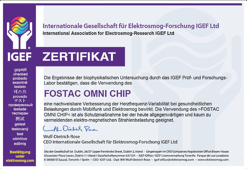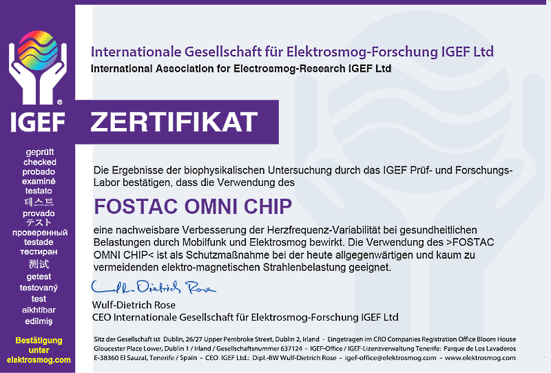 Die Anforderungen der Int. Gesellschaft für Elektrosmog-Forschung IGEF für die Auszeichnung des FOSTAC OMNI CHIP mit dem IGEF-Prüfsiegel werden erfüllt.