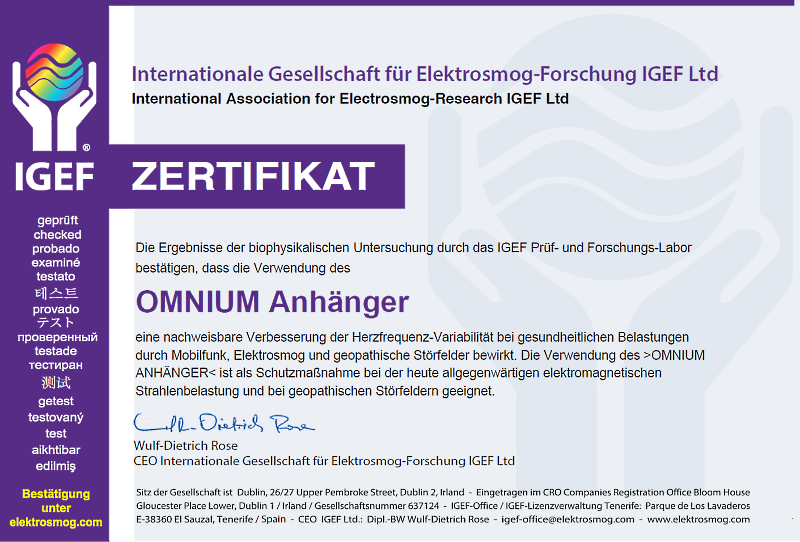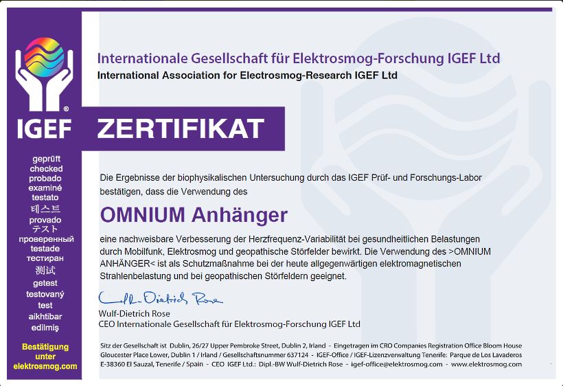 Die Anforderungen der Int. Gesellschaft für Elektrosmog-Forschung IGEF für die Auszeichnung des OMNIUM ANHÄNGER mit dem IGEF-Prüfsiegel werden erfüllt.